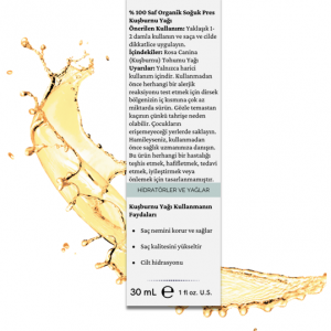 Rosehip oil provides you with excellent moisturization without disturbing the sebum balance, thanks to the minerals, vitamins and linoleic acid it contains. In addition, it protects your skin against moisture loss for a long time by creating a barrier that does not clog pores on the skin and does not leave an oily feeling while doing this. It has a dry oil type consistency that is extremely easily absorbed. It also protects and provides hair moisture. It improves hair quality. Provides skin hydration.